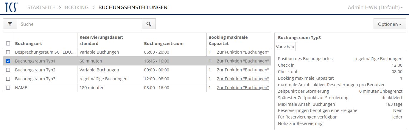 - Die Ansicht enthält eine Tabelle (linker Teil) und eine Art Vorschau (rechter Teil) auf die Eigenschaften des aktuell ausgewählten Buchungsortes