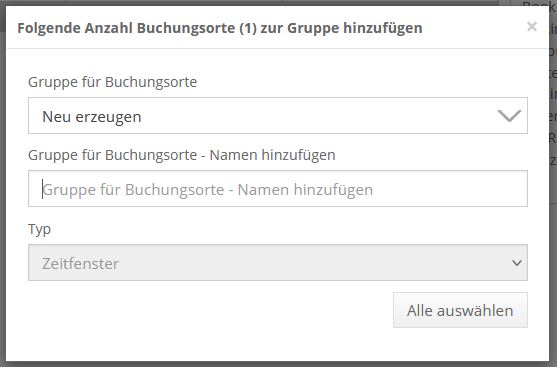 - kann aber auch eine existierende Gruppe für das Hinzufügen eines (mehrerer) Buchungsorte auswählen