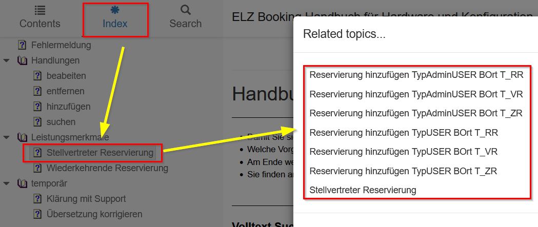 - Das Auwählen des Stichwortes zeigt eine Liste aller relevanter Stellen im Handbuch