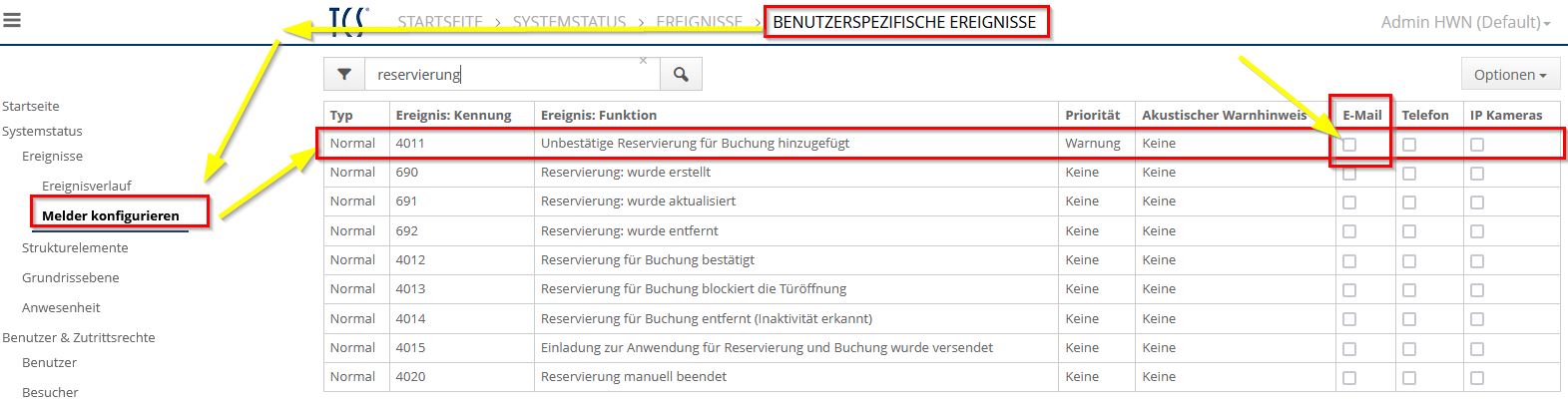 - das Ereignis einer Reservierung muss mit der Option ausgestattet werden, eine Mitteilung auslösen zu können