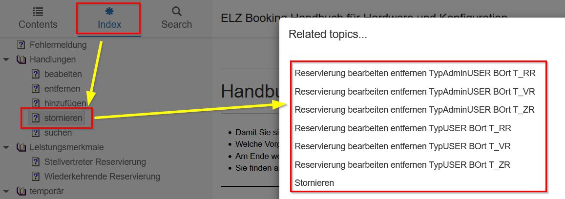 - Das Auswählen des Stichwortes zeigt eine Liste aller relevanter Stellen im Handbuch
