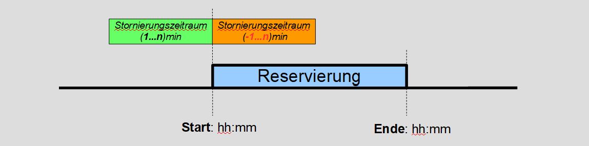 - Soll eine Stornierung auch noch nach dem Starttermin der Reservierung möglich sein, dann muss die Dauer in Minuten mit