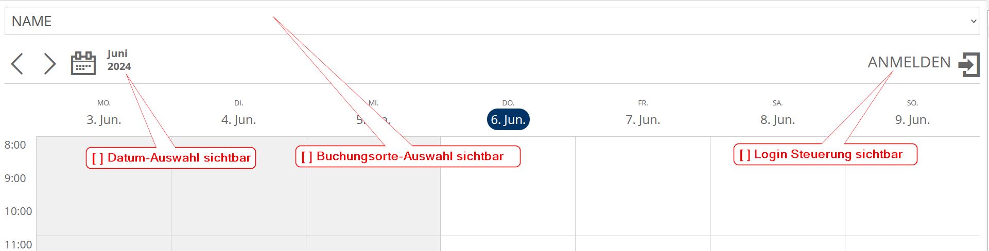 - nur mit der sichtbaren Auswahl für das Datum, kann ein gewünschter Termin außerhalb des aktuell dargestellten Kalender-Abschnittes gewählt werden